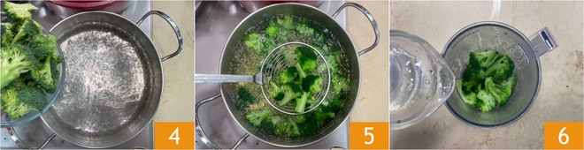 Kochen Sie die Brokkoli in kochendem Salzwasser für 5 Minuten 4, dann abgießen 5. Behalten Sie 20 Röschen zurück, sie werden zum Anrichten benötigt, den Rest geben Sie in eine Schüssel und fügen etwas Wasser hinzu 6.