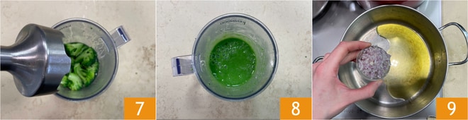 Mixen Sie alles mit einem Stabmixer 7, bis eine glatte und homogene Creme entsteht 8. Erhitzen Sie in einem Topf das Öl bei mittlerer Hitze, dann fügen Sie die Schalotte hinzu 9 und braten Sie für ein paar Minuten, bis die Schalotte durchsichtig wird.