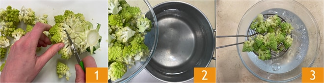 Um das Risotto mit Brokkoli und schneller Bagna Caoda zuzubereiten, reinigen Sie zuerst den Romanesco-Brokkoli 1, dann tauchen Sie die Röschen in einen Topf mit kochendem Salzwasser 2 und blanchieren sie etwa 4-5 Minuten. Die Brokkoli in einer Schüssel mit kaltem Wasser und Eis abkühlen 3. Bewahren Sie das Kochwasser auf und halten Sie es warm, da es zum Kochen des Risottos benötigt wird.