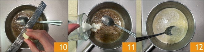 Fügen Sie ein Viertel einer geriebenen Knoblauchzehe hinzu 10, dann die Sahne 11 und lassen Sie sie bei schwacher Hitze einige Minuten reduzieren 12.