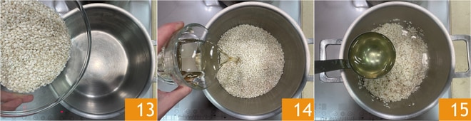 Nun widmen Sie sich dem Kochen des Risottos: Geben Sie den Reis in einen Topf 13, salzen Sie ihn und rösten Sie ihn trocken, während Sie ständig rühren. Wenn die Körner sehr heiß sind, löschen Sie sie mit Weißwein ab 14 und lassen ihn vollständig verdampfen. Beginnen Sie, den Reis zu kochen, indem Sie einen Schöpflöffel nach dem anderen vom Brokkoli-Kochwasser 15 hinzufügen, wobei Sie immer warten, bis die Flüssigkeit absorbiert ist, bevor Sie die nächste hinzufügen.