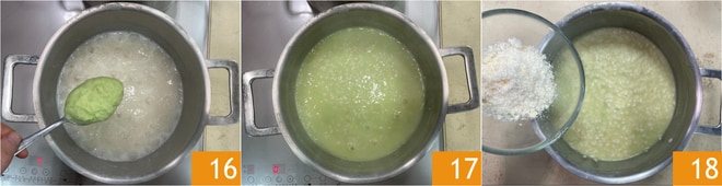 Gegen Ende der Kochzeit fügen Sie die Brokkolicreme hinzu 16 und kochen den Reis fertig 17. Sobald er gar ist, den Herd ausschalten und mit dem geriebenen Pecorino und Parmesan verfeinern 18.