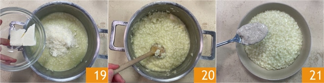 Fügen Sie auch die gut gekühlte Butter hinzu 19 und lassen Sie das Risotto ein paar Minuten ruhen, zugedeckt mit einem Tuch, bevor Sie gut umrühren 20. Jetzt können Sie das Risotto anrichten und mit der Sardellen-Soße garnieren 21.