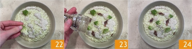 Vervollständigen Sie mit den zurückbehaltenen Röschen 22, den Sardellenstücken und einer Prise Pfeffer 23. Ihr Risotto mit Brokkoli und schneller Bagna Caoda ist servierfertig 24!