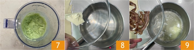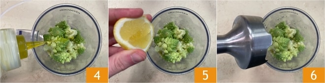 Geben Sie die Brokkoli in einen Behälter und behalten Sie einige für das Anrichten zurück, dann fügen Sie das Öl 4, den Zitronensaft 5 und das Salz hinzu. Pürieren Sie mit einem Stabmixer 6.