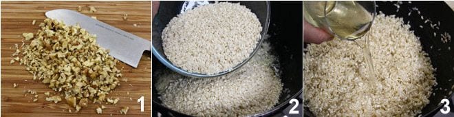 Um den Risotto mit Gorgonzola, Birnen und Walnüssen zuzubereiten, beginnen Sie mit der Zubereitung einer Gemüsebrühe, Gemüsebrühe, um zu sehen, wie es geht. Hacken Sie dann die Walnüsse grob 1 und legen Sie sie beiseite. Schneiden Sie die Schalotte fein, geben Sie sie in einen Topf mit 30 g Butter; lassen Sie sie weich werden und fügen Sie den Reis hinzu, den Sie für ein paar Minuten anrösten 2: geben Sie den Weißwein dazu und lassen Sie ihn verdunsten 3,