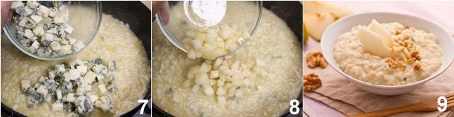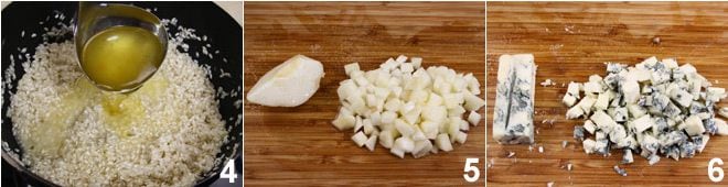fügen Sie dann nach und nach, sobald der Reis trocknet, jeweils eine Kelle Brühe hinzu 4, bis zur vollständigen Garung (ca. 15 Minuten). In der Zwischenzeit schälen Sie die Birnen, entfernen Sie die inneren Kerne und schneiden Sie sie in Würfel 5. Pürieren Sie eine der beiden Birnen mit einem Mixer. Entfernen Sie die Rinde des pikanten Gorgonzolas und schneiden Sie ihn in Würfel 6.