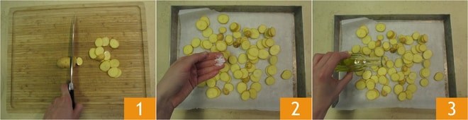 Um den Risotto zuzubereiten, waschen, trocknen und schneiden Sie die neuen Kartoffeln in etwa 2 mm dicke Scheiben 1, legen Sie sie auf ein mit Backpapier ausgelegtes Backblech und würzen Sie sie mit Salz 2 und Öl 3. Backen Sie sie im vorgeheizten Ofen bei 200 Grad für 30 Minuten.