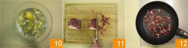 Legen Sie sie in eine Schüssel mit Wasser und Zitronensaft, um zu verhindern, dass sie sich verfärben 10. In der Zwischenzeit den Schinken in Streifen schneiden 11, in eine heiße Pfanne geben 12.
