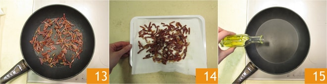 Braten Sie ihn bei hoher Hitze gut an. Wenn er knusprig ist 13, legen Sie ihn auf ein Abtropfblech mit Küchenpapier 14 und halten Sie ihn bereit. Erhitzen Sie etwas Öl in derselben Pfanne 15.