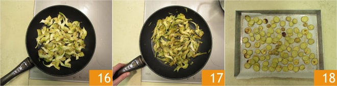Fügen Sie die Artischocken hinzu 16 und braten Sie sie bei starker Hitze (etwa 6/7 Minuten) und salzen Sie sie. Wenn sie gut gebräunt sind 17, schalten Sie die Hitze aus und halten Sie sie bereit. In der Zwischenzeit sind die Kartoffeln gebacken, nehmen Sie sie aus dem Ofen 18 und lassen Sie sie bei Raumtemperatur stehen.