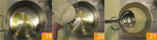 Beginnen Sie mit dem Kochen des Risottos. Erhitzen Sie etwas Öl in einem Topf 19, geben Sie den Reis hinzu 20 und rösten Sie ihn einige Minuten. Löschen Sie ihn mit einer Kelle Gemüsebrühe ab 21.