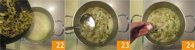 Fügen Sie ¾ der Artischocken hinzu, die restlichen behalten Sie für das Anrichten. Fahren Sie mit dem Kochen des Reises für etwa 15 Minuten fort, rühren Sie gelegentlich um und fügen Sie eine Kelle Brühe hinzu, wenn der Reis beginnt, trocken zu werden 23, salzen Sie nach Geschmack 24.