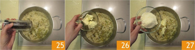 Wenn er fertig gekocht ist, die Hitze ausschalten und mit Salz und Pfeffer abschmecken 25. Mit Butter 26, Parmesan 27 und umrühren.