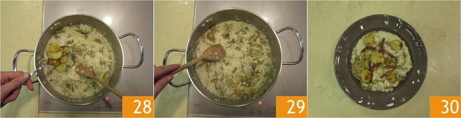 Fügen Sie am Ende die gerösteten Kartoffeln hinzu 28 und mischen Sie vorsichtig 29. Richten Sie Ihren Reis an und legen Sie einige Artischockenstücke, einige Kartoffelscheiben und den knusprigen Schinken darauf. Ihr Risotto mit Artischocken und Kartoffeln ist bereit, heiß serviert zu werden!