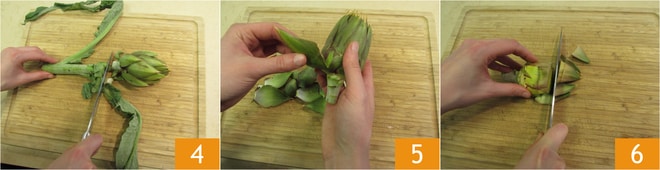 In der Zwischenzeit die Artischocken putzen: Schneiden Sie einen Teil des Stiels ab 4, entfernen Sie die äußeren Blätter 5 und die Spitze 6.