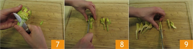 Schälen Sie mit einem kleinen Messer den verbleibenden Stiel, um die härtere äußere Schicht zu entfernen 7. Schneiden Sie die Artischocken in Viertel 8 und dann jede in 16 kleine Stücke 9.