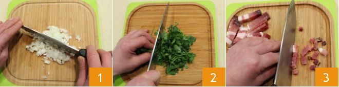 Um das Risotto mit Bier und Speck zuzubereiten, beginnen Sie damit, die weiße Zwiebel zu schälen und fein zu hacken 1, und legen Sie sie beiseite. Waschen Sie die Petersilie und hacken Sie sie ebenfalls fein mit dem Messer 2. Nehmen Sie nun die Scheibe Speck und schneiden Sie sie in sehr kleine Würfel 3.