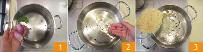 Um das Risotto mit Feigen zuzubereiten, beginnen Sie mit der Brühe: Füllen Sie einen großen Topf mit Wasser und würzen Sie mit Pfeffer, der geschälten Schalotte und dem Lorbeer 1. Zum Kochen bringen und dann warm halten. In einer anderen Pfanne geben Sie einen Schuss Olivenöl extra vergine 2, einige Körner Sichuan-Pfeffer und lassen Sie sie ein paar Minuten rösten. Geben Sie den Reis in die Pfanne 3 und rösten Sie ihn etwa 3 Minuten, bis er gut heiß ist.