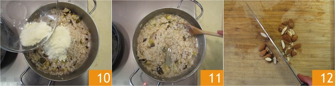 Würzen Sie mit geriebenem Parmigiano Reggiano DOP 10. Gut mischen 11. Die Mandeln grob hacken 12.