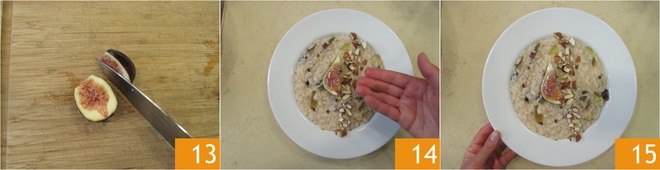 Schneiden Sie eine Feige in Spalten 13 und servieren Sie das Risotto mit Feigen, indem Sie die Teller mit den Mandeln 14 und der frischen Feige 15 garnieren.