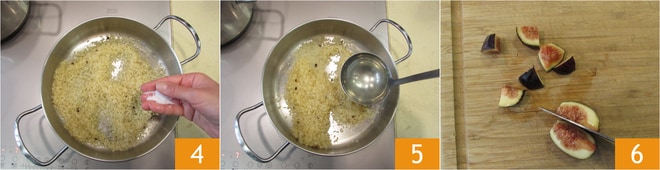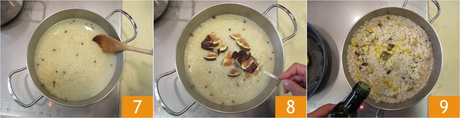 Nach den 5 Minuten 7 geben Sie die Feigen hinzu 8 und mischen Sie. Bringen Sie den Reis durch Zugabe von Brühe nach Bedarf zum Kochen. Schalten Sie die Hitze aus und schwenken Sie mit einem Schuss Olivenöl 9.
