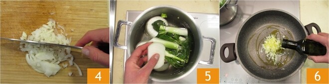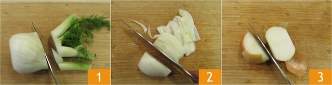 Hackenn Sie eine der beiden Zwiebellhälften fein 4. Geben Sie die Reste der Fenchel und die andere Zwiebelhälfte in einen Topf mit Wasser 5. Zum Kochen bringen. In der Zwischenzeit geben Sie einen Schuss Öl und die gehackte Zwiebel in eine Pfanne 6.