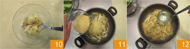 Übertragen Sie ein Drittel der gekochten Fenchel in eine Schüssel und legen Sie sie für die Dekoration des Tellers zur Seite 10. Geben Sie den Reis in die Pfanne mit den gekochten Fenchel 11, salzen Sie und rösten Sie bei starker Hitze für ein paar Minuten, dann bedecken Sie alles mit der vorbereiteten Brühe aus den Resten 12.