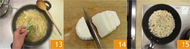 Fügen Sie auch die Kräuter hinzu 13. Kochen Sie den Reis, indem Sie bei Bedarf etwa 20 Minuten lang Brühe hinzufügen. Schneiden Sie den Primosale in Scheiben 14. In einer Pfanne rösten Sie die Mandelblättchen 15.