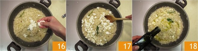 Nach der Garzeit schalten Sie das Feuer aus und rühren Sie den Risotto mit dem zerbröckelten Primosale 16, mischen Sie 17 und beenden Sie mit einem Schuss Öl 18. Richten Sie an, indem Sie mit den beiseitegelegten Fenchel, den gerösteten Mandeln und einigen Salbeiblättern dekorieren. Der Risotto mit Fenchel und Primosale ist bereit, genossen zu werden.