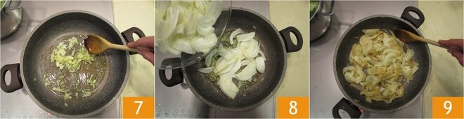 Braten Sie die Zwiebel für einige Minuten an 7. Fügen Sie auch die in Scheiben geschnittenen Fenchel hinzu 8 und braten Sie sie in der Pfanne an, bis sie goldbraun sind 9.