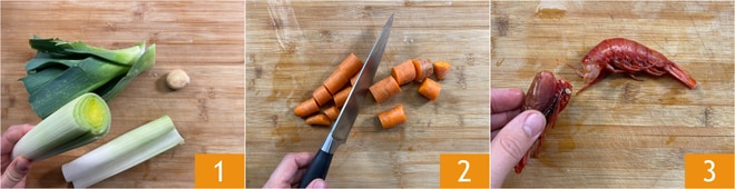 Um den Risotto mit Garnelen und Lauch zuzubereiten, reinigen Sie den Lauch, indem Sie die grünen Blätter und die Basis entfernen, dann schälen Sie ihn, um die äußere Schicht zu entfernen 1. Waschen und bewahren Sie die Abfälle auf. Waschen und schneiden Sie die Karotte in Stücke 2. Schließlich reinigen Sie die Garnelen und bewahren die Schalen auf 3.