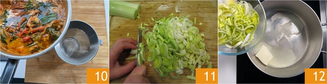 Filtern Sie den Fond mit einem Sieb 10 und halten Sie ihn warm. Schneiden Sie den Lauch in dünne Scheiben 11 und lassen Sie ihn im Butter gut schmoren 12.