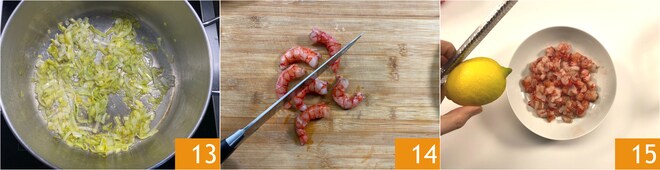 Wenn er goldbraun ist 13, legen Sie ihn beiseite. Schneiden Sie die Garnelen in Stücke 14 und würzen Sie sie mit Salz und Zitronenschale 15.