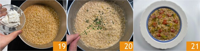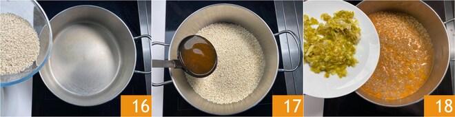 Rösten Sie den Reis trocken an 16 und beginnen Sie, ihn zu kochen, indem Sie nach und nach den Fond hinzufügen, sobald er absorbiert wird 17. Nach etwa 10 Minuten fügen Sie den geschmorten Lauch hinzu 18 und bringen den Reis zur Garung.
