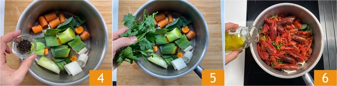 In einem Topf bereiten Sie den Fond zu: Geben Sie die Abfälle von Garnelen und Lauch, die Karotte, Salz und Pfeffer hinzu 4, einen Zweig Petersilie 5. Fügen Sie auch die Abfälle der Garnelenreinigung hinzu, ein Schuss Öl und rösten Sie alles bei hoher Hitze an 6.