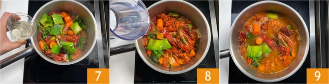 Löschen Sie mit dem Wein ab 7. Sobald der Alkohol verdampft ist, gießen Sie kaltes Wasser hinzu 8 und lassen Sie es eine Stunde lang kochen 9.