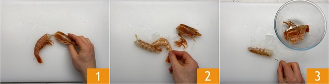 Um das Risotto mit Garnelen und Zucchini zuzubereiten, beginnen Sie mit der Wie man Garnelen reinigt: Entfernen Sie den Kopf 1, das Panzer und die Beine (bewahren Sie alles auf) 2, dann entfernen Sie den Darm, indem Sie den schwarzen Faden herausziehen 3.