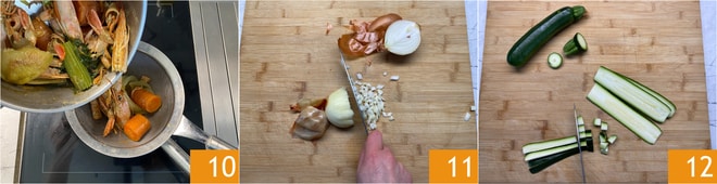Nach dem Kochen den Fond abseihen 10 und warmhalten. In der Zwischenzeit die Zwiebeln schälen und fein hacken 11. Die Zucchini abschneiden und in 1 cm große Stücke schneiden 12.