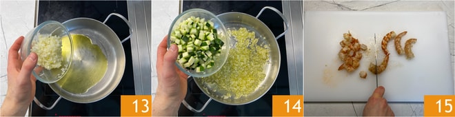 Geben Sie das Öl in einen Topf und lassen Sie die gehackte Zwiebel 1 Minute bei niedriger Hitze anbraten 13, dann erhöhen Sie die Hitze, geben Sie die Zucchini hinzu und braten Sie sie etwa 5 Minuten lang an 14. In der Zwischenzeit auch die Garnelenschwänze in 1 cm große Stücke schneiden 15.