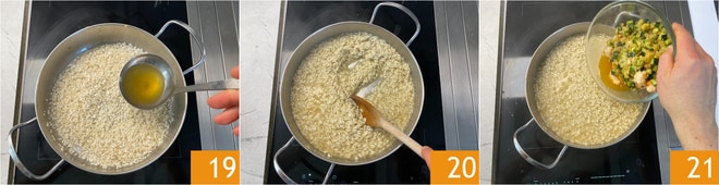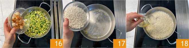 Fügen Sie nun die Garnelen hinzu und kochen Sie sie eine Minute weiter 16, dann geben Sie alles in eine Schüssel. Geben Sie den Reis in denselben Topf 17 und rösten Sie ihn, während Sie häufig rühren. Wenn die Körner heiß sind, gießen Sie den Weißwein dazu 18 und lassen Sie ihn verdunsten.