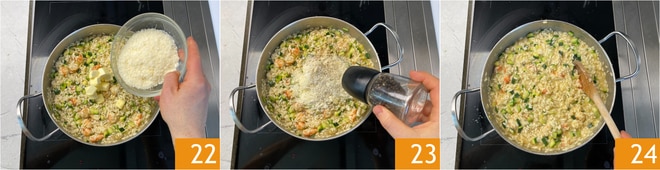 Sobald der Reis gekocht ist, schalten Sie die Flamme aus und verfeinern Sie mit Butter und Parmesan 22, pfeffern Sie 23 und rühren Sie um 24.