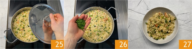 Decken Sie den Topf mit einem Deckel ab 25 und lassen Sie ihn ein paar Minuten ruhen. Abschließend das Risotto mit fein gehacktem Schnittlauch aromatisieren 26. Ihr Risotto mit Garnelen und Zucchini ist servierbereit 27!