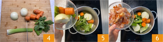 Bewahren Sie die gereinigten Garnelenschwänze auf (am besten mit einem feuchten Handtuch bedeckt). In der Zwischenzeit reinigen und zerkleinern Sie grob Sellerie, Karotte und Zwiebel 4. Erhitzen Sie das Gemüse kurz in Öl 5, dann fügen Sie die Garnelenschalen hinzu 6.