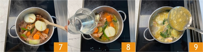 Rösten Sie die Mischung einige Minuten bei starker Hitze 7. Fügen Sie Wasser hinzu 8, salzen Sie und lassen Sie alles sanft etwa eine Stunde köcheln: Während des Kochens das aufsteigende Schaum abschöpfen, um die Oberfläche zu reinigen 9.