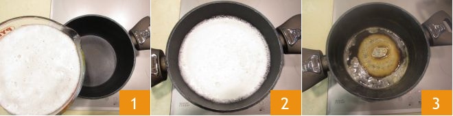 Beginnen Sie als Erstes mit der Zubereitung der Bierreduktion. Wir empfehlen, diese einen Tag vorher zuzubereiten und bei Raumtemperatur aufzubewahren. Stellen Sie einen Topf auf den Herd, gießen Sie das Bier hinein 1 und erhöhen Sie die Hitze auf das Maximum. Sobald das Bier sich erhitzt, beginnt es zu schäumen 2. Achten Sie darauf, da das Bier aufsteigen und aus dem Topf überlaufen könnte. Reduzieren Sie dann die Hitze und lassen Sie es etwa 1 Stunde 3 köcheln, dabei gelegentlich umrühren, bis der Alkohol vollständig verdampft ist und Sie eine Konsistenz ähnlich wie Karamell mit einer bernsteinfarbenen Farbe erreicht haben.