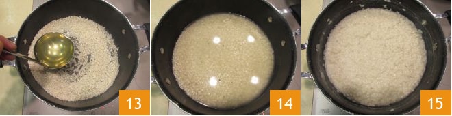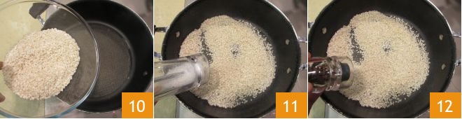 Kommen wir nun zum Reis. Erhitzen Sie einen Topf, geben Sie den Reis hinein 10 und rösten Sie ihn trocken, dabei gelegentlich umrühren. Während des Röstens fügen Sie eine Prise Salz 11 und eine Prise Pfeffer 12 hinzu.
