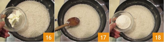Fügen Sie die kalte Butter aus dem Kühlschrank hinzu 16 und schwenken Sie das Risotto 17. Sobald die Butter vollständig eingearbeitet ist, fügen Sie den geriebenen Käse hinzu 18 und schwenken Sie das Risotto weiter,