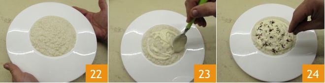klopfen Sie mit der Hand auf den Boden, um es flach zu machen 22. Fügen Sie mit einem Löffel die Grana Padano-Creme hinzu 23, dann das Kaffeepulver 23