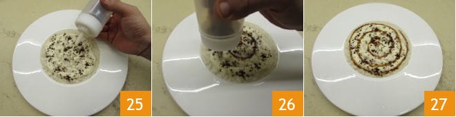 und vervollständigen Sie mit der Bierreduktion 25, indem Sie eine Spirale 16 machen. Servieren Sie das Risotto und genießen Sie es noch heiß 27.